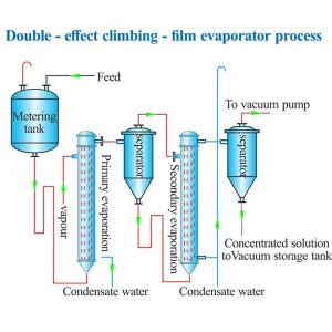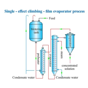 этот испаритель требует тщательной конструкции и эксплуатации, а это означает, что вторичный пар внутри нагревательной трубки должен иметь высокую скорость и достичь высокого коэффициента теплопередачи, чтобы гарантировать, что питательный раствор достигает желаемой концентрации через нагревательную трубку за один проход. обычно при атмосферном давлении скорость на выходе верхнего конца трубы поддерживается на уровне 20-50 м/с, а в вакуумных условиях она может достигать 100-160 м/с. испаритель с восходящей пленкой подходит для обработки растворов с большой скоростью испарения, термочувствительностью, низкой вязкостью и легким пенообразующим, но не подходит для растворов с высокой вязкостью, склонностью к кристаллизации или накипью. по сравнению с испарителем с падающей пленкой он имеет меньшую установленную мощность.