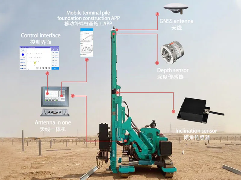 Аппаратное обеспечение объединяет различные устройства, такие как высокоточные терминалы позиционирования и ориентации GPS/Beidou, антенны GNSS, датчики наклона, датчики глубины и т. Д. эти устройства устанавливаются на различных свайных приводах и вместе образуют ядро интеллектуальной системы свайных приводов. Спутниковая система позиционирования Beidou используется для мониторинга положения бурения и обеспечения того, чтобы свайщик мог выполнять строительство в соответствии с заданным положением; датчик наклона используется для мониторинга вертикальности корпуса сваи, обеспечивая, чтобы корпус сваи оставался вертикальным во время процесса набивания сваи; датчики тока используются для мониторинга изменений геологических структур. Анализируя различные изменения параметров, можно определить твердость геологической структуры и соответственно регулировать параметры строительства свай.