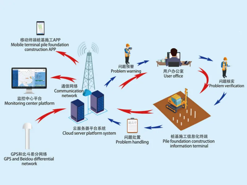 Информационная система строительства свай представляет собой набор систем, предназначенных специально для управления качеством строительства микропористых монолитных свай. Система состоит из четырех основных частей: сборного оборудования, установленного на свай, дифференциальной системы позиционирования, платформы облачных сервисов и мобильного приложения. Данные в реальном времени, собранные системой, загружаются на платформу управления, предупреждающая информация зарабатывается порогом, установленным в соответствии с спецификациями строительства, и отправляется персоналу по управлению пользователями. После проверки на месте, решения проблем, подтверждения результатов и других бизнес-процессов осуществляется управление процессом строительства свай для цементации микроотверстий для обеспечения качества проекта.
