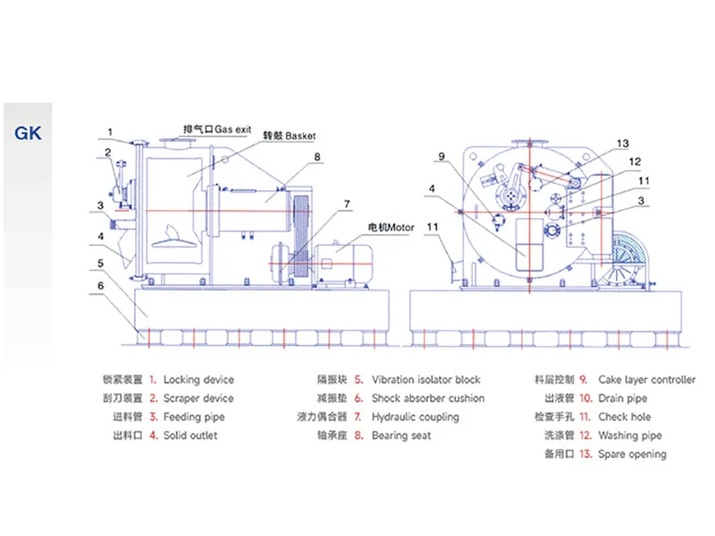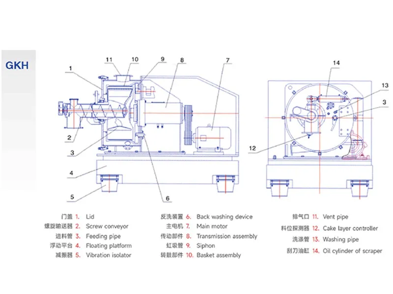 ● Доступны два режима разгрузки: разгрузка желоба с простой конструкцией; и разгрузка через скролл-конвейер и скребок, отличающийся высокой скоростью захвата твердого торта и эффективно предотвращая блокировку.